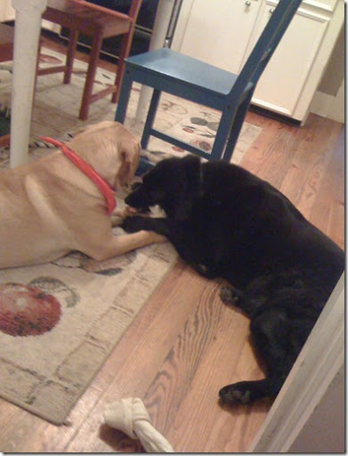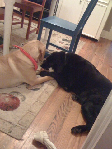 Instead, here is a fun picture of Teddy and Bucky "cooperating". More like Teddy had a bone. Bucky came along to take it, and was too lazy to leave with it and started chewing it while Teddy was still holding it! Oh that killed me! SHG tried to get some pics and this is the best one: